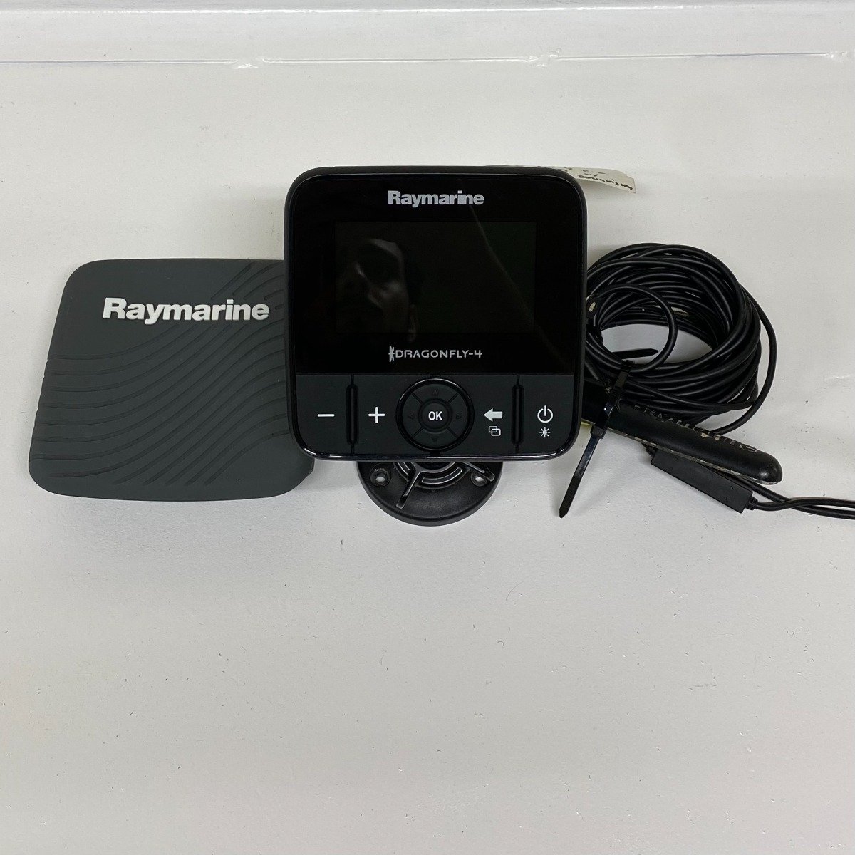 Used Raymarine Dragonfly-4 Pro. The unit is in good working condition. Includes transducer, mount, power cord, and cover. The display is very clean with no deep scratches.